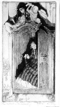 A female figure comes out of a cupboard on top of which three doll-like figures wait, one of which holds a club. Etching by F. Carter, 1908.