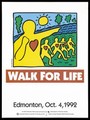 Silhouettes of people with hearts walking representing an advertisement for the AIDS Walk for Life in Edmonton Canada, Sunday Oct 4 1992. Colour lithograph after Keith Haring.