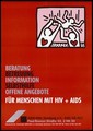 Two silhouette figures by Keith Haring with red hearts holding another figure aloft; advertising services provided by the AIDS-Hilfe Hamburg e.V. Colour lithograph, 199-.