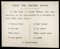 What the doctor found : in the body of Frank Wilson, who was operated on for appendicitis in a hospital at Cairo (Ill.), were found:- a button hook, a hat pin, three keys, a lead pencil, a belt buckle, a toy pistol, three small nails, a needle, a thermometer.