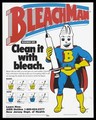 Superman disguised as 'bleachman' wearing a condom as a hat, holding a syringe and bearing the letter 'B' for bleach; instruction leaflet on how to clean syringes issued by the San Francisco AIDS Foundation. Colour lithograph, 1988.