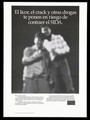 Recto: two blurred figures with a warning about the risk of drug abuse and AIDS in Spanish; a poster from the America responds to Aids advertising campaign. Lithograph.