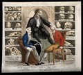In a room filled with skulls of the famous, the phrenologist Gall examines William Pitt the Younger and Gustavus IV, the King of Sweden, both currently plagued by Napoleon. Coloured etching, 1806.