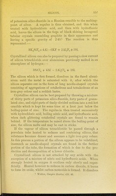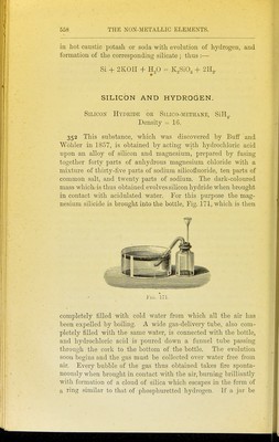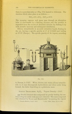 ![them in a porcelain tube (a h Fig. 172) heated to whiteness. The reaction which takes place is as follows :— Si02+2C+2CI2 - SiCl^ + 2C0. The escaping vapours and gases pass through an absorption tube (c) surrounded by a freezing mixture, and the product is separated from the excess of absorbed chlorine by shaking it up with metallic mercury and subseqiient distillation. Silicon tetrachloride is an acrid colourless liquid, fuming in the air, having a specific gravity at 0° of 1'52408 and boiling at 59°'57 (Thorpe.) The specific gravity of its vaj)our^ according Fig. 172. to Dumas, is 5*937. When thrown into water silicon tetrachlo- ride is at once decomposed, hydrochloric and silicic acids being formed, the latter depositing as a gelatinous mass. Silicon Tkiciiloiude, SioClg. Vapour Density = 134-1. 354 Friedel obtained this coriipound by gently heating the cor- responding tri-iodide with mercuric chloride.^ The samecompoimd was obtained by Troost and Hautefeuille ^ by passing the vajiour 1 Cmnptes Ite7idits, Ix.viii. lon. Ann. Chim. Phys. [5] vii. 461.](https://iiif.wellcomecollection.org/image/b21449016_0576.jp2/full/800%2C/0/default.jpg)