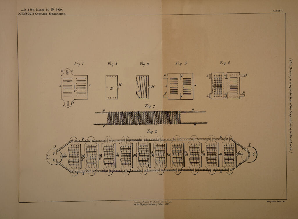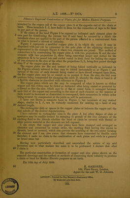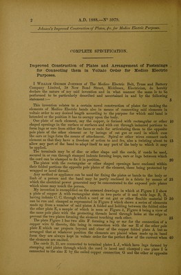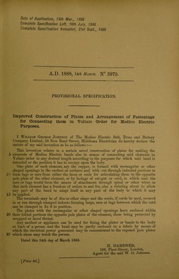 ![Date of Application, 14th Mar., 1888 Complete Specification Left, 16th July, 1888 Complete Specification Accepted, 21st Sept., 1888 A.D. 1888, 14th March. N° 3979. PROVISIONAL SPECIFICATION. Improved Construction of Plates and Arrangement of Fastenings for Connecting tliem in Voltaic Order for Medico Electric Purposes. I William George Johnson of The Medico Electric Belt, Truss and Battery Company Limited, 58 New Bond Street, Middlesex Electrician do hereby declare the nature of my said invention to be as follows :— This invention relates to a certain novel construction of plates for making the 5 elements of Medico Electric bands also in means of connecting said elements in Voltaic order to any desired length according to the purposes for which said band is intended or the position it has to occupy upon the body. One plate of each element, say the copper, is formed with rectangular or other shaped openings in the surface or surfaces and with cut through indented portions to 10 form lugs or ears from either the faces or ends for articulating them to the opposite pole plate of the other element, or by lacings of cat-gut or cord, in which case the ears or lugs would form the means of attachment through spiral or other wires so that each element has a freedom of action to and fro, also a twisting about to allow any part of the band to adapt itself to any part of the body to which it may 15 be applied. The terminals may be of disc or other shape and the cords, if cords be used, secured in or run through stamped indents forming loops, ears or lugs between which the cord can be clamped to fix it in position. The plates with the rectangular or other shaped openings have enclosed within 20 their folded portions the opposite pole plates of the element, these being protected by wrapped or laced thread. Any method or appliance can be used for fixing the plates or bands to the body or limb of a person and the band may be partly enclosed in a fabric by means of which the electrical power generated may be concentrated to the exposed pole plates 25 which alone may touch the person. Dated this 14th day of March 1888. H. GARDNER, 166, Fleet Street, London, Agent for the said W. G. Johnson. [Price 8J.]](https://iiif.wellcomecollection.org/image/b30740502_0001.jp2/full/800%2C/0/default.jpg)