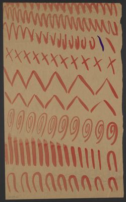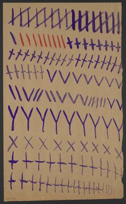 Credit: Red loops, spirals, zigzags, crosses and lines with one purple diagonal, and purple crosses, slashes, Y and V shapes, with a section of red diagonals. Source: Wellcome Collection.