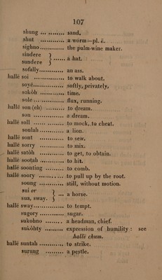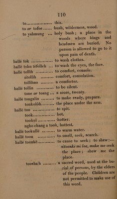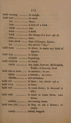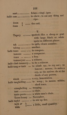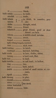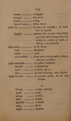 ![{UMNO seesseeeeeee A DEQLAT. tumack seccccees the neck. LUMO] «2. secceeres a dog. tun or toon...... little, short. hallé tin ...... sea eeee . to sing; to trouble; to look for; to search. tingah ......... palaver, the trouble into which a person often brings himself, which is settled at badle or barry: see cheeradh. hallé tunk.......seceeese to be deep. LONE Sisiesocuens deepness. ULTINK werecccscees root. ania tunkah ... deep men, wise people; judges, lawyers, scribes. hallé tankdlah ......... to gather together. tirmah ......... a chamelion. Currt staves. sp .. atown—pl. n. {USS ...-seseeeesree proud, boasting, vain, fopish. hallé bé tuss ......... to possess pride, to be vain, foolish. . U. Ubank ......... a rope, slavery. ubell ...... ceeee arat. ubeng —..seeeeee, @ foot. Hboh . ...0+...ae0 bread. abulloh ..... w a Shark. Tid yO ..scsereeeee food. Tidyéé ......cceeee murder.](https://iiif.wellcomecollection.org/image/b33029696_0120.jp2/full/800%2C/0/default.jpg)
