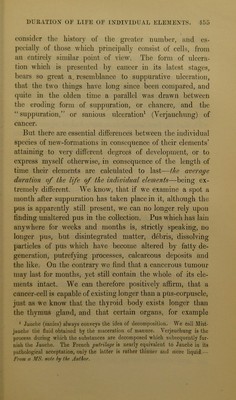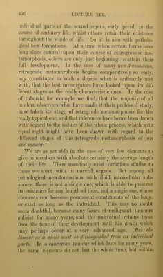 ![450 iiidividuiil parts of tlie sexual organs, early ])eiisli in the course of ordinary life, whilst others retain their existence throughout the whole of life. So it is also with patholo- gical new-fonnations. At a time when certain forms have long since entered upon their course of retrogressive me- tamorphosis, others are only just beginning to attain their full development. In the case of many new-fonnations, retrograde metamorphosis begins comparatively so early, nay constitutes to such a degree what is ordinarily met with, that the best investigators have looked upon its dif- ferent stages as the really characteristic ones. In the ease of tubercle, for example, we find, that the majority of all modern observers who have made it their professed study, have taken its stage of retrograde metamorphosis for the really typical one, and that inferences have hence been drawn with regard to the nature of the whole process, which with equal right might have been drawn wdth regard to the ^ different stages of the retrograde metamorphosis of pus ^ and cancer. We are as yet able in the case of very few elements to give in numbers with absolute certainty the average length of their life. There manifestly exist variations similar to those we meet with in normal organs. But among all ^ pathological new-formations with fluid intercellidar sub- stance there is not a single one, wdiich is able to preserve i its existence for any length of time, not a single one, whose 1 elements can become permanent constituents of the body, 3 or exist as long as the individual. This may no doubt % seem doubtful, because many forms of malignant tumours || subsist for many years, and the individual retains them £ from the time of their development until his death Avhich u may perhaps occur at a very advanced age. Bui the Jj- tumour as a ivhole must be distinguished from its individual gjarts. In a cancerous tumour which lasts for many years, the same elements do not last the whole time, but within](https://iiif.wellcomecollection.org/image/b21308986_0486.jp2/full/800%2C/0/default.jpg)