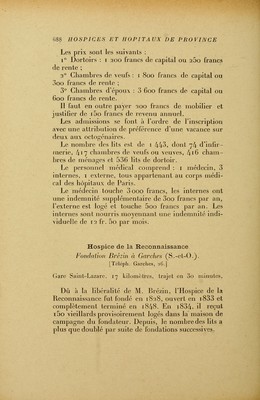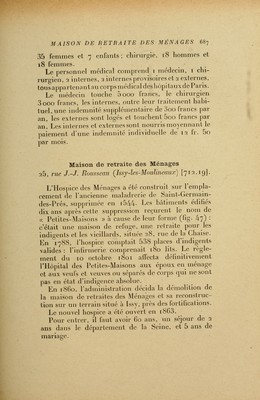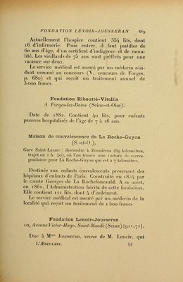 ![institua l'Assistance publique sa légataire univer- selle, cette fondation fut ouverte en 1880. A cette fondation est jointe celle de M'e veuve Dagnan, qui a légué une somme nécessaire pour l'entretien de 10 lits. La fondation contient 2 18 lits, réservés à des vieil- lards de 70 ans, reconnus indigents : 132 lits d'hommes, 76 lits de femmes et 10 lits d'infirmerie. Le service médical est assuré par un médecin de la localité qui reçoit un traitement annuel de 5oo francs. Hospice Saint-Miebel Fondation Boulard, à Saint-Mandé (Seine) 10, Avenue Victor-Hugo [911.71]. M. Michel-Jacques Boulard, ancien tapissier à Paris, a légué par testament en date du i5 février 1825 différentes sommes s'élevant après liquidation à 1 128000 francs environ pour la fondation d'un hos- pice de vieillards qui devait recevoir 12 septuagé- naires pauvres à raison de un par arrondissement de Paris. L'hospice fut ouvert le l\ août i83o. Le revenu laissé par le fondateur étant en rentes sur l'Etat, et celles-ci ayant régulièrement baissé, on dut suspen- dre les admissions en 1860. En 1870, il n'y avait que k ou 5 administrés. En 187/1, grâce au legs de Mme Lenoir-Jousserand, on put rétablir les 12 lits. En 1876, 2 autres y ont été ajoutés, par suite d'un nouveau legs. Conditions d'admission : 70 ans, indigence ou infir- mités incurables, domicile de secours à Paris, absence de tout casier judiciaire (pour les 12 premiers lits, versement de 120 francs représentant le prix du trousseau). Pour les 12 premiers lits la désignation appartient aux 20 arrondisssements de Paris à tour](https://iiif.wellcomecollection.org/image/b21172304_0780.jp2/full/800%2C/0/default.jpg)