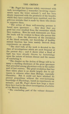 ![Mr. Paget has become widely conversant with such investigations [‘ researches involving experi- ments upon the lower animals ’], and has been deeply impressed with the greatness of the benefits which they have conferred upon mankind, and the giievous mistake that is made by those who desire to suppress them. -The action of these well-meaning persons is based upon ignorance . . . they deny that any good has ever resulted from the researches which they condemn. How far such statements are from the truth will be evident to those who peruse this book. . . . from the discovery of the circulation of the blood onwards, our knowledge of healthy animal function has been mainly derived from experiments on animals. The chief bulk of the work is devoted to the class of investigations which are most frequent at the present day ; and it shows what a flood of light has been already thrown by bacteriology upon the nature of human disease and the means of combating it. The chapter on the Action of Drugs will be to many a startling disclosure of the gross ignorance that prevailed among physicians even in the earlier part of last century. The great revolution that has since taken place is no doubt largely due to ad- vances in sciences other than Biology, especially Chemistry. But it could not have attained its present proportions without the ever-increasing knowledge of Physiology, based on experiments on animals ; and Mr. Paget shows how large a share these have had in the direct investigation of articles of the Materia Medica. “ The concluding part of the volume discusses](https://iiif.wellcomecollection.org/image/b24860591_0109.jp2/full/800%2C/0/default.jpg)