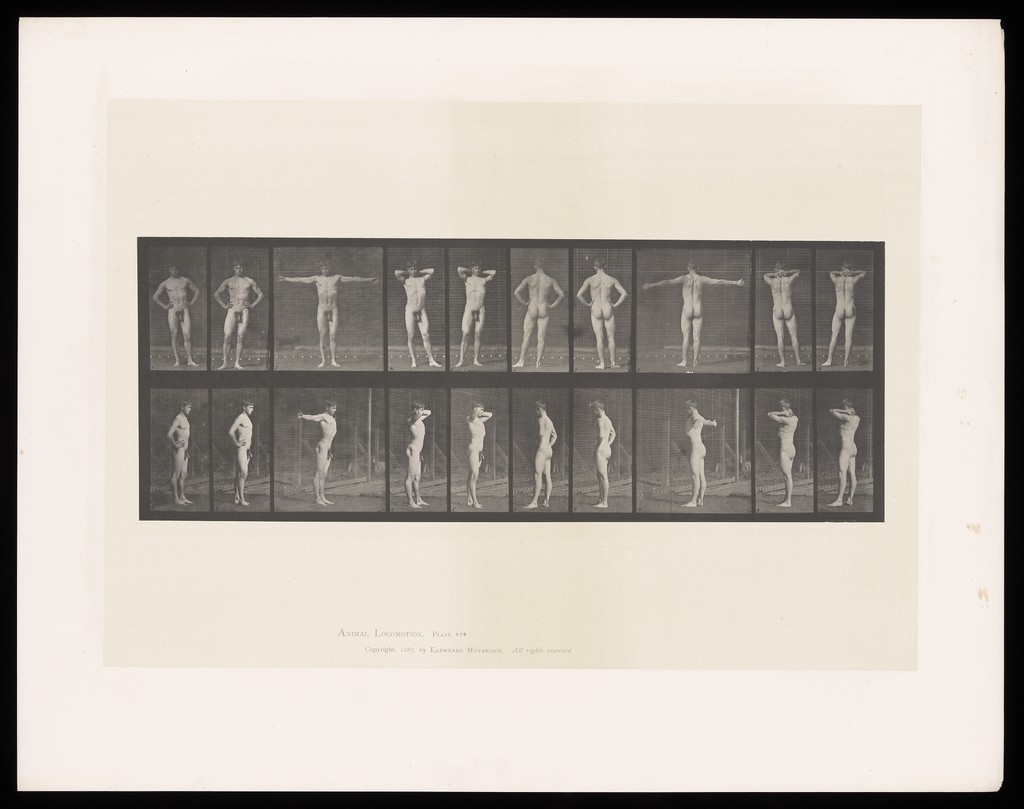Credit: A naked man stretches his arms and clasps his hands behind his head. Collotype after Eadweard Muybridge, 1887. Source: Wellcome Collection.