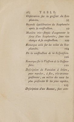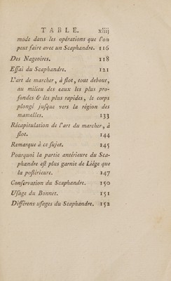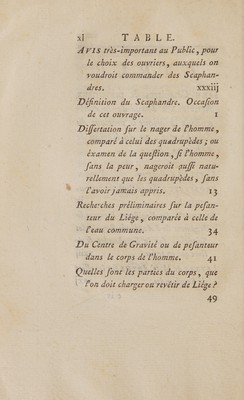 ![Scaphandre , ou du Bateau de l'Homme, &c. E PITRE dédicatoire. Page v PROSPECTUS 6 analyfe de cer ou- k VrAge | IX EXTRAIT des Repifires, Rapport & Jugement de l Académie Royale des Sciences » Jur de Scaphandre & de livre qui en traite. XxIi] LETTRE de M, D'ARTUS Le Les effets du Scaphandre, : _XXX] C iv](https://iiif.wellcomecollection.org/image/b33019952_0049.jp2/full/800%2C/0/default.jpg)