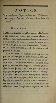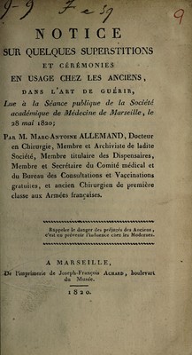 Notice sur quelques superstitions et cérémonies en usage chez les anciens, dans l'art de guérir, lue à la Séance publique de la Société academique de Médecine de Marseille, le 28 mai 1820.